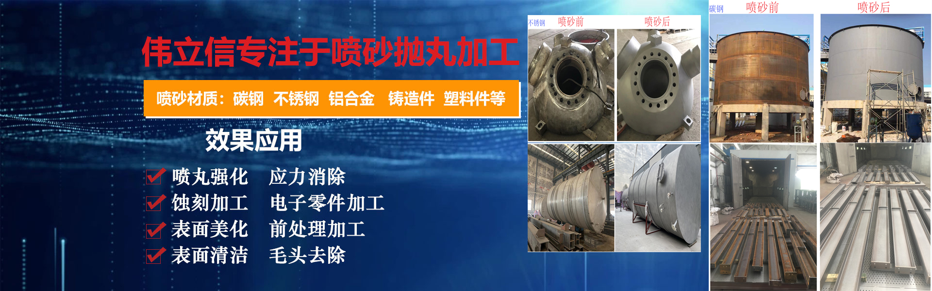 武漢偉立信機(jī)械設(shè)備有限公司(噴砂熱線(xiàn):18186495283)是一家從事表面涂裝和表面清理設(shè)備的廠(chǎng)家,公司位于武漢市武昌區(qū)。是一家集表面涂裝和表面清理設(shè)備科研、開(kāi)發(fā)、生產(chǎn)、銷(xiāo)售、服務(wù)于一體的綜合型企業(yè)。     公司自創(chuàng)建以來(lái),一直秉持認(rèn)真、負(fù)責(zé)的態(tài)度,以其科學(xué)而嚴(yán)密的管理,先進(jìn)而不斷創(chuàng)新的技術(shù),致力于表面處理設(shè)備的研制和開(kāi)發(fā),主要產(chǎn)品有:手動(dòng)噴砂機(jī)、自動(dòng)噴砂機(jī)、開(kāi)放式加壓噴砂機(jī)、干濕式噴砂機(jī)及大型噴砂房,拋丸機(jī),除塵設(shè)備,另可根據(jù)客戶(hù)要求定做。低價(jià)經(jīng)營(yíng)各類(lèi)噴砂磨料:玻璃珠、鋼砂、鋼丸、不銹鋼丸、鋼絲切丸···